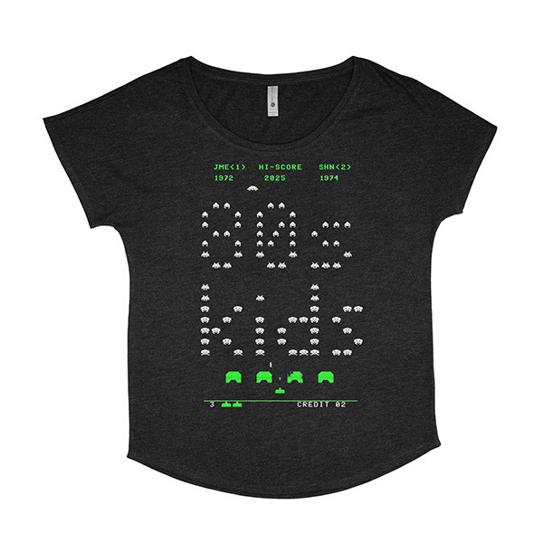 Space Invaders design is available in crew tee, scoop tee, and tote.